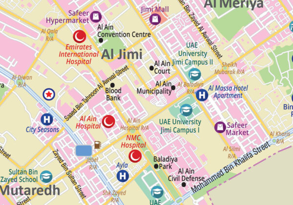 This 2D map shows areas, highways, major roads, parks, shopping malls, attractions, schools, hospitals, hotels etc., within Al Ain. Currently, the map is available in English but can be customized in other foreign languages as per request. It serves as an excellent wall map to dress your office or home walls.